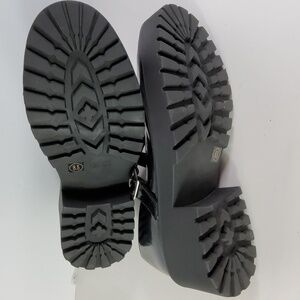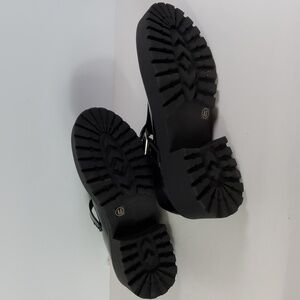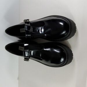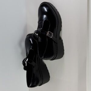 Sleek black flats with a glossy finish. Features a stylish buckle strap. Comfortable and versatile.