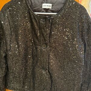 This Steve Madden black lace blazer exudes elegance with its intricate floral patterns and lightweight, sheer material. Perfect for formal occasions, it adds a sophisticated touch to any outfit. The long sleeves and delicate design make it an ideal overlay for evening wear.
