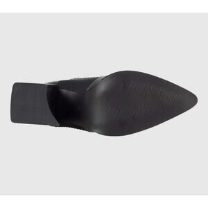 The boots are black in color, leather, pointed toe, fabric around the ankle, chunky block heel, fits snug around the ankle.