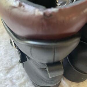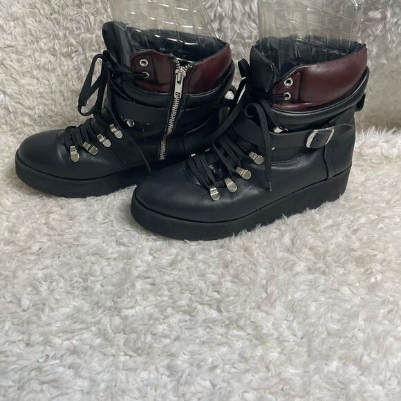 Steve Madden Black Leather lace up wedge Boots brown trims side zipper …