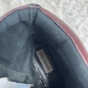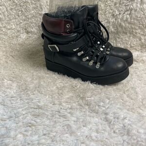 Steve Madden Black Leather lace up wedge Boots brown trims side zipper Size 9.5pre owned in FAIR used condition the boots have some peelings on the top brown trim doesn’t affect the beauty of the boots see all pictures any questions please message.