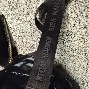 Discover the perfect travel companion with this Steve Madden duffle bag, crafted from sleek metallic puffer material in a striking black hue. Designed for unisex adults, this bag combines style and functionality with its spacious interior and multiple pockets, ensuring all your essentials are organized and within reach. The detachable shoulder strap offers versatile carrying options, while the additional pouch and durable hardware add to its practicality. This pre-owned bag is in good condition, showing light signs of use with a small repair on the bottom exterior.