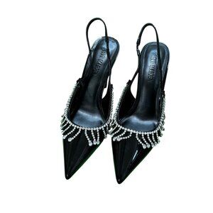 Add instant glam to your evening look with these brand new with tags Steve Madden slingback heels in a sleek black patent finish. Adorned with dazzling rhinestone fringe along the vamp, these pointed-toe pumps bring red carpet vibes to any outfit. A stiletto heel and slingback strap complete the elegant, party-ready design.