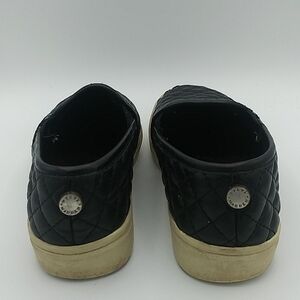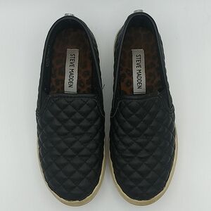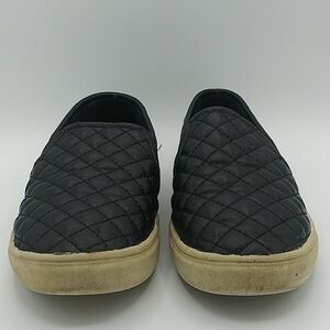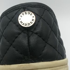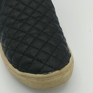 Steve Madden Girl's Black Quilt Upper Detail Round Toe Slip On Casual Loafer Shoes. Leather/Textile Upper. Rubber Sole. Elastic Step In Side Panels. Discoloration/Wear On Sole. Leather Peel In Toe Ends. Size 3.