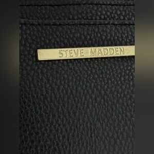 This Steve Madden shoulder bag features a sleek black design with a structured silhouette and a flap closure. The bag is accented with gold hardware, adding a touch of elegance to its minimalist style. Its adjustable shoulder strap ensures comfort and versatility for everyday use.