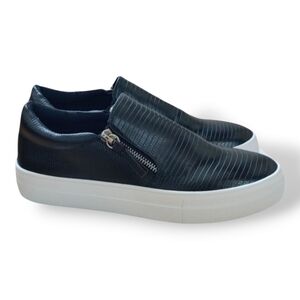 Stylish black slip-on sneakers with a textured finish and side zippers. Perfect for casual wear.