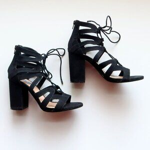 Steve Madden Black Suede Open Toe Lace Up Cut Out Block Heel Bootie Shoes Size 7