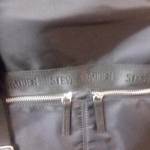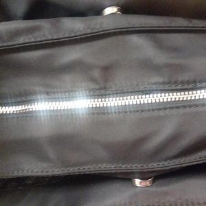 Black leather handles, two front zip pockets, inside one zip pocket, two slip pockets
