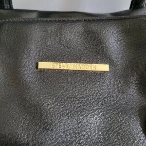 This elegant black tote from Steve Madden features a structured silhouette with gold-tone hardware, offering both top handles and a detachable shoulder strap for versatile carrying options. The soft, slightly textured leather finish adds a touch of sophistication, making it perfect for both casual and formal occasions.