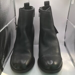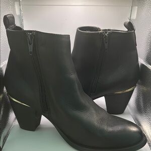 These Steve Madden ankle boots feature a sleek black leather finish accented by gold-toned zippers, offering a touch of elegance. The medium-height block heel and minimalist design make them perfect for versatile styling. With a rounded toe and ankle-height cut, they provide both comfort and sophistication.