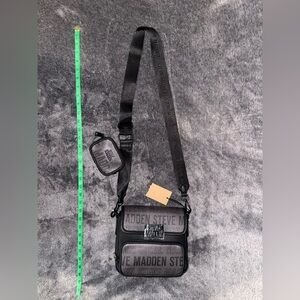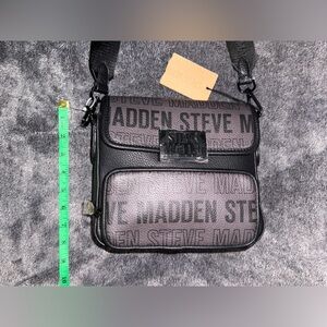 Sleek Steve Madden messenger bag with adjustable strap. Features embossed logo design. Ideal for daily essentials.