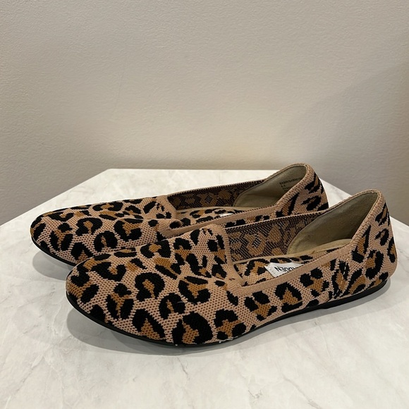 These Steve Madden flats feature a striking leopard print design with a tan base and black spots, crafted from a suede-like material. The rounded toe and flat sole offer comfort and style, making them a versatile addition to any wardrobe. Used once. Excellent condition