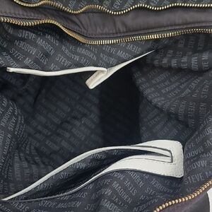 This Steve Madden dufflw/travel bag showcases a bold black and white color-blocked design, perfect for a sporty and casual look. Crafted for everyday use, it combines durability with a sleek, modern style. The prominent 'STEVE MADDEN' text adds a touch of brand flair to this versatile accessory.