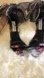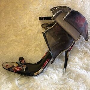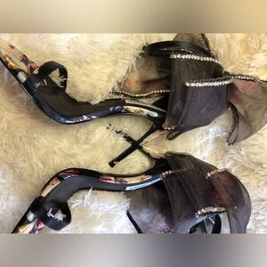Chic black heels featuring a vibrant floral pattern. Adorned with a stylish bow for added flair.