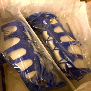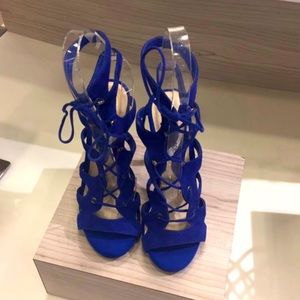 These striking Steve Madden heels feature a vibrant blue hue and a gladiator-inspired lace-up design. The intricate straps wrap elegantly around the foot and ankle, creating a bold and modern statement. Perfect for formal occasions, these heels combine a classic stiletto with a contemporary twist.