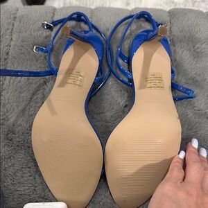 Elevate your style with these stunning blue heels from Steve Madden, featuring a sleek stiletto design and elegant strappy details. The glossy straps wrap delicately around the foot, offering a sophisticated look perfect for special occasions. A neutral-toned footbed provides a subtle contrast, enhancing the vibrant blue hue.