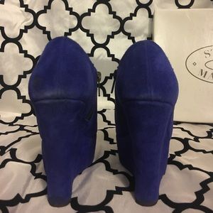 Steve Madden Blue Suede Wedges open toe. Size 6. Shoes have some wear but still have a lot of life left in them. Very cute and comfy. Box is included if you want it! Let me know if you want to see more pictures :)
