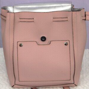 Chic and feminine Steve Madden backpack in soft blush pink faux leather with a floral scarf tie accent on the front flap. Features a pebbled texture, silver-tone hardware, and a metallic silver interior for a modern touch. Perfect size for everyday use—fits essentials like a wallet, phone, keys, small tablet, and cosmetics. Lovely everyday bag for work, school, or travel. The floral scarf adds a fun, feminine touch that makes it stand out!