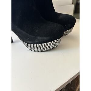 The Steve Madden bootie platform vintage in size 9 is a stylish and trendy women's shoe. This black suede bootie features a platform sole and a short heel, making it both fashionable and comfortable for everyday wear. It is perfect for adding a touch of edgy sophistication to any outfit, and the brand's reputation for quality and style ensures that these boots are a versatile and timeless addition to any wardrobe.