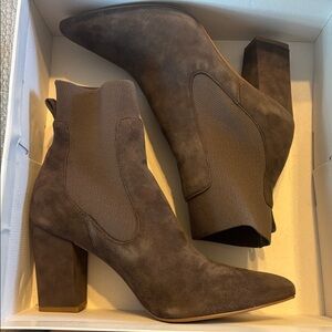 Chic suede ankle boots. Block heel design. Elastic side panels for easy wear.
