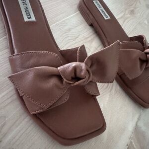 These Steve Madden sandals feature a rich brown color with a striking bow detail on the top strap, offering a chic and contemporary look. The flat sole and square-shaped toe provide comfort and style, making them perfect for casual summer outings. Slip into these minimalist sandals for a touch of elegance and femininity. Wear on toe reflected in price.
