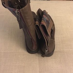 These lightly worn brown Steve Madden combat boots are a great buy! They can be worn 2 ways: as regular height combat boots or buttoned down to show the black/pink/agua Aztec pattern.