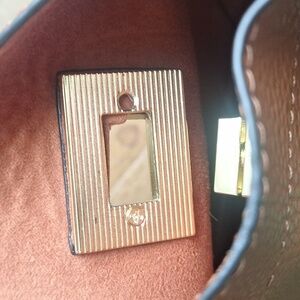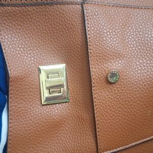 Elegant tan crossbody bag by Steve Madden with udjustable strap and front outer pocket. Measures approx 9 tall, 10 wide, 5 deep. A screw is missing on a gold buckle.