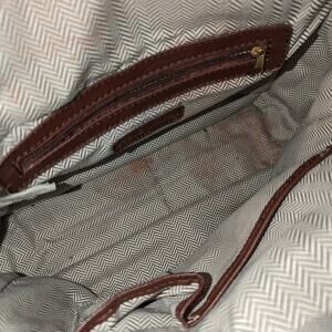 Great medium/large size bag perfect for fall! Fit all your essentials and more. Lots of pockets, large middle compartment. Brown with gold hardware. Crossbody strap and handles for versitle use.