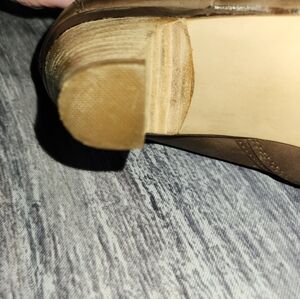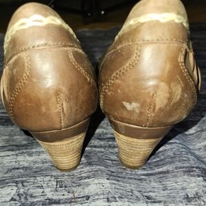 Keywords: brown pumps, leather heels, ruched toe shoes, block heel pumps, round toe heels, comfortable heels, casual heels, work shoes, business casual shoes, vintage style heels, retro pumps