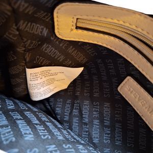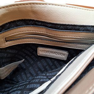 This Steve Madden shoulder bag is the perfect addition to your collection. With its stylish fold over flap and gold chain accents, this bag is sure to turn heads. The taupe and brown exterior colors are neutral enough to match any outfit, and the shoulder strap is made of PU and gold chain for a touch of elegance.