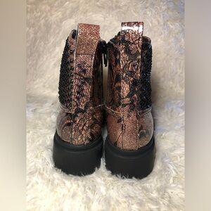 Stylish combat boots with lace-up design. Features black studs and floral pattern. Perfect for a bold look.