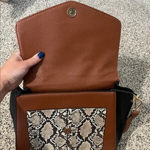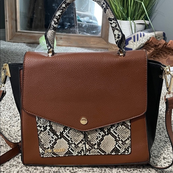 Chic Steve Madden satchel with rich brown and snake pattern design. Ideal for versatile styling.