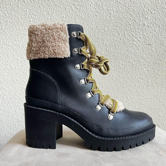 Steve Madden Bundle Up Block Heel Platform Combat Leather Boots with Faux Fur