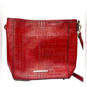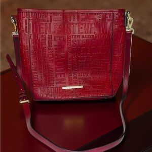 Red / Burgundy purse with “STEVE MADDEN” printed all over it, long crossbody strap with gold colored chains at the ends. GREAT condition!!