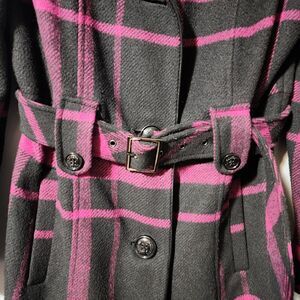 Steve Madden Button w/Belt Wool Blend Coat Pink Black Plaid large