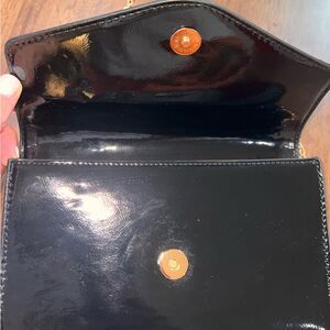Beautiful black patent leather purse with a removable gold chain. Magnet closure.