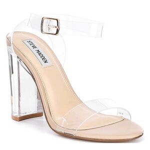 From Steve Madden, Camille Clear Ankle Strap Block Heel Dress Sandals feature: