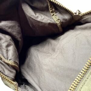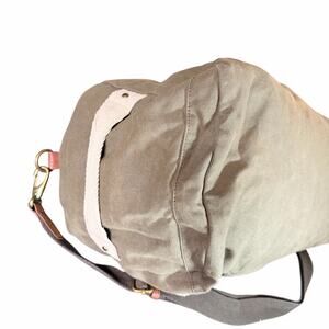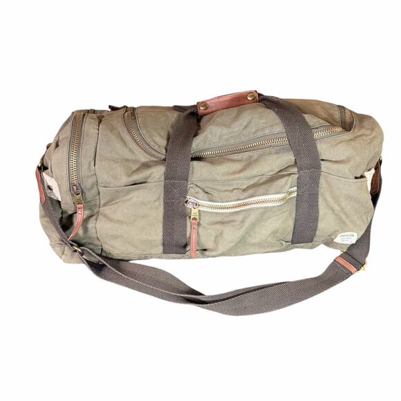 Steve Madden olive green canvas duffel bag with brown web straps and leather-trimmed zipper pulls. Features multiple exterior zip pockets, full zip closure, adjustable shoulder strap, and durable utility-style design—perfect for travel, gym, or weekend outings. Preloved with light wear but overall great shape and fully functional. Spacious interior and rugged hardware give it a stylish, adventure-ready look.