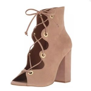 Steve Madden Tan lace up tie nubuck leather bootie with open toe. 3.5” heel 4 3/4” shaft. Size 7. In great preowned condition. Light padding. Smoke and pet free home