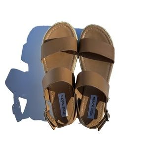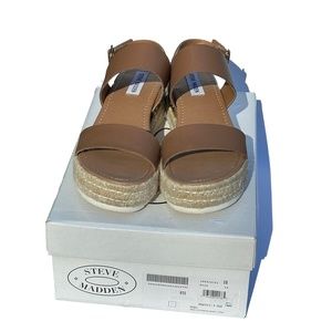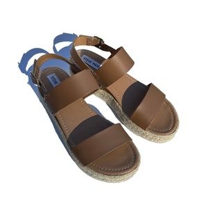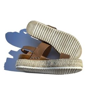 True Women's Size 8.5, cute sandals with wood detail under heel. Comes with original box. Mild wear, bottoms have been scrubbed clean but some color remains as pictured.