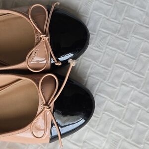 Steve Madden Cherish Cream and Black Flats Low Block Heel with Bow Accent