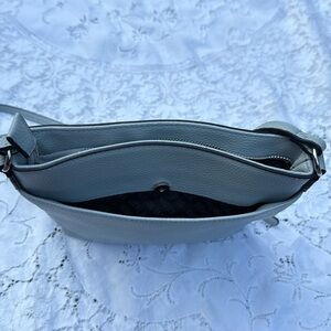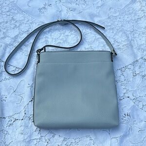 Sleek light blue crossbody bag with a modern design. Ideal for daily wear. Main zipper pocket has smaller zip pocket inside and two smaller inside pockets. large open Front pouch and back pocket with snap closure. Like new. No signs of wear.