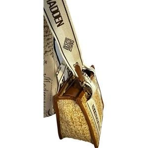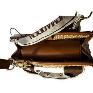 The bag has a magnetic closure and gold tone hardware, with a detachable strap, coin purse, adjustable strap, logo, and other accents that make it a perfect fit for travel, wedding, party/cocktail, casual, workwear, or business occasions. The bag is made of polyurethane and a straw-like fabric type, with a beige lining material. Enjoy this beautiful handbag without worrying about its condition because it is new and comes with tags.