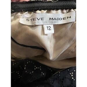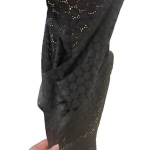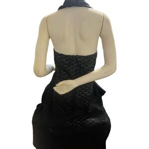 Black lace overlay over nude lining. Collared halter with oversized pockets. A cute throwback look.