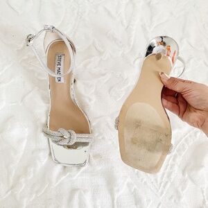 Metallic faux leather upper with manmade sole. Ankle buckle closure. Faux leather lining. Jewel encrusted knot at vamp. Square toe. Approx 100mm/ 4 inch heel.