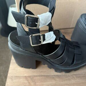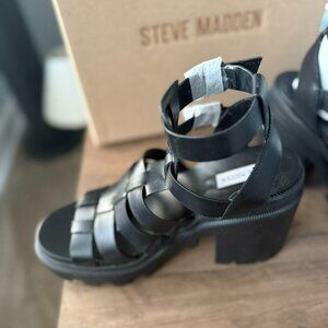 The perfect height for day to night.Step into timeless style with the Cosmic Sandal by Steve Madden, a 90s inspired black fisherman sandal perfect for any fashionable occasion. Crafted with a vegan leather upper material and lining, these sandals offer both style and an animal-friendly choice. Featuring an adjustable ankle buckle closure, they sit comfortably with approximately a 4.25-inch chunky heel, elevating your silhouette effortlessly. Ideal for adult women, these round toe, high block heels are a chic addition for fall trends and music festivals alike.