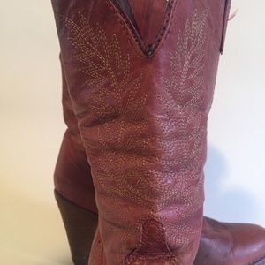 These boots Show wear around leather interior lining and heels, but still are very sturdy and cute. Decorative sewing on front, back, and toe.