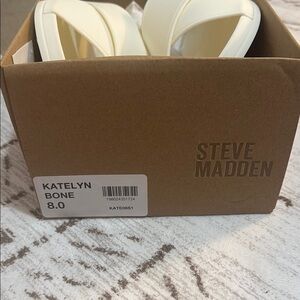 Elevate your style with these Steve Madden sandals, featuring a chic cream color and geometric cutout design. The minimalist wide band and flat sole offer a sophisticated look, perfect for any casual occasion. Crafted with a smooth material, these sandals provide both elegance and comfort.