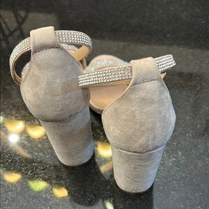 These elegant cream heels from Steve Madden feature a sparkling rhinestone-adorned strap that adds a glamorous touch. The slender high heel and delicate ankle strap provide a sophisticated look, perfect for formal events or evening wear. These are in very good condition! My daughter wore them to prom. They would look amazing on a bride or bridesmaid!! Even mother of the bride/groom:)