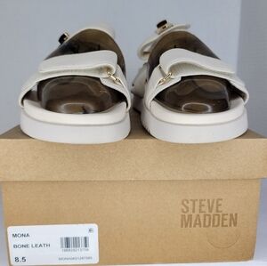 Elegant cream leather sandals with gold hardware. Comfortable and chic design. Pre-owned, i worn them a couple of times, have a small stain on the right side toe,not even noticeable, size 8.5 medium, smoke-free home.